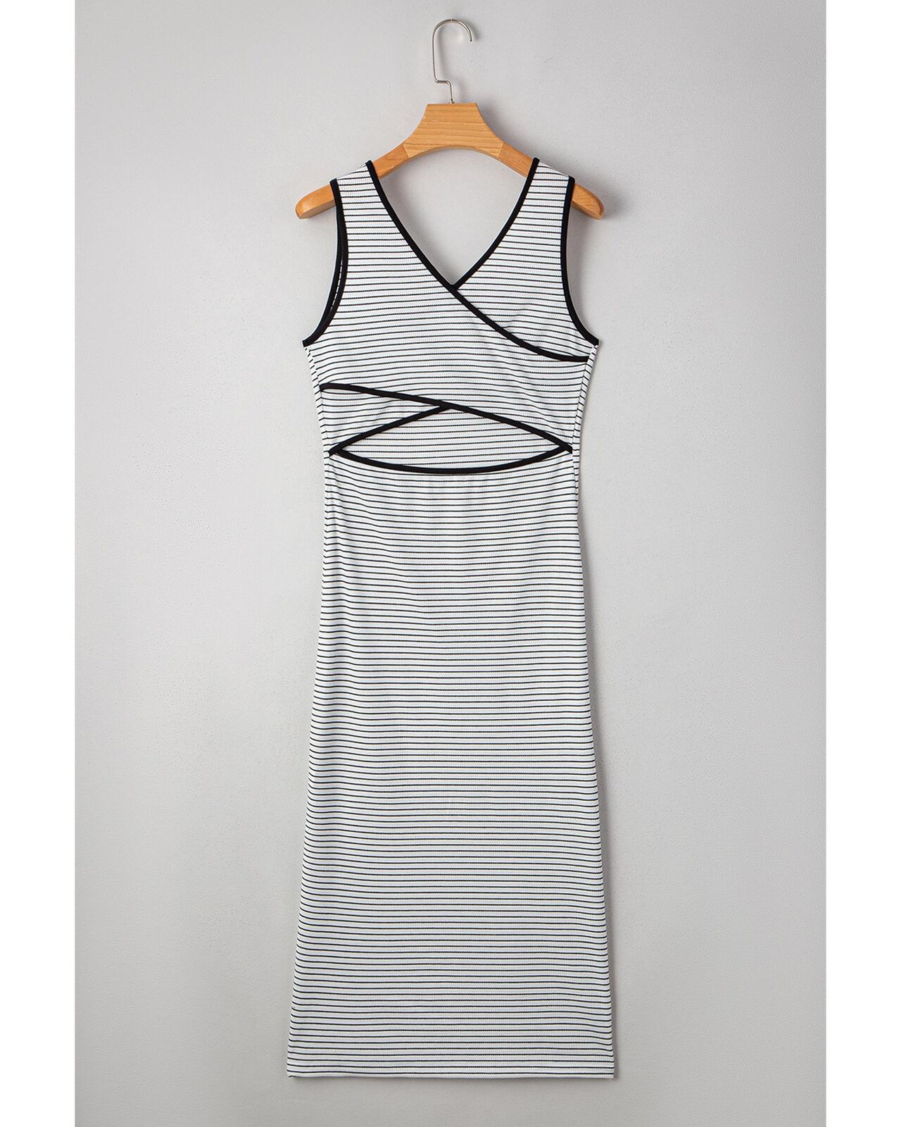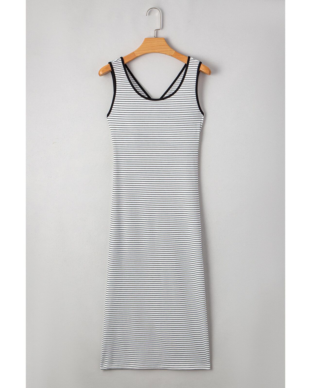 • White Stripe Criss Cross Side Slits Slim Fit Sleeveless Midi Dress