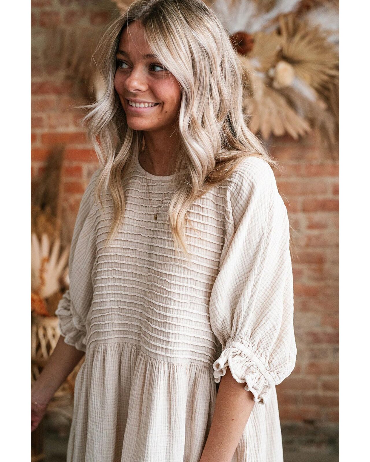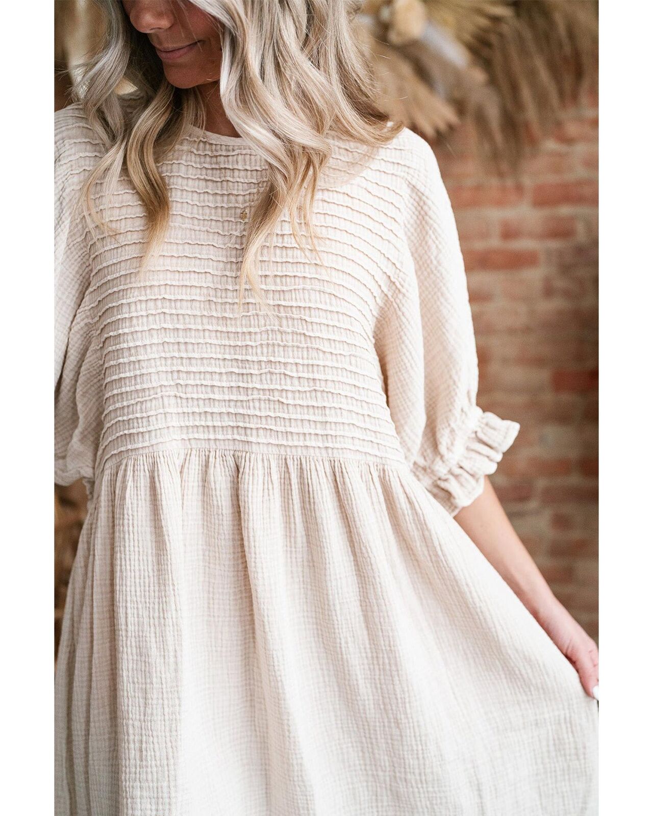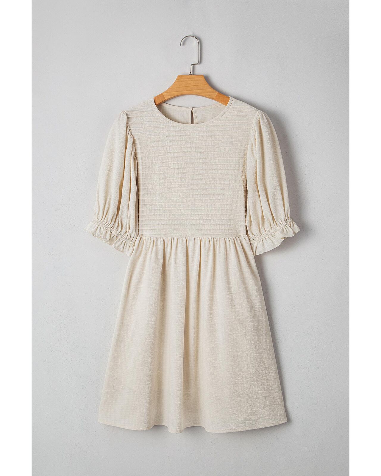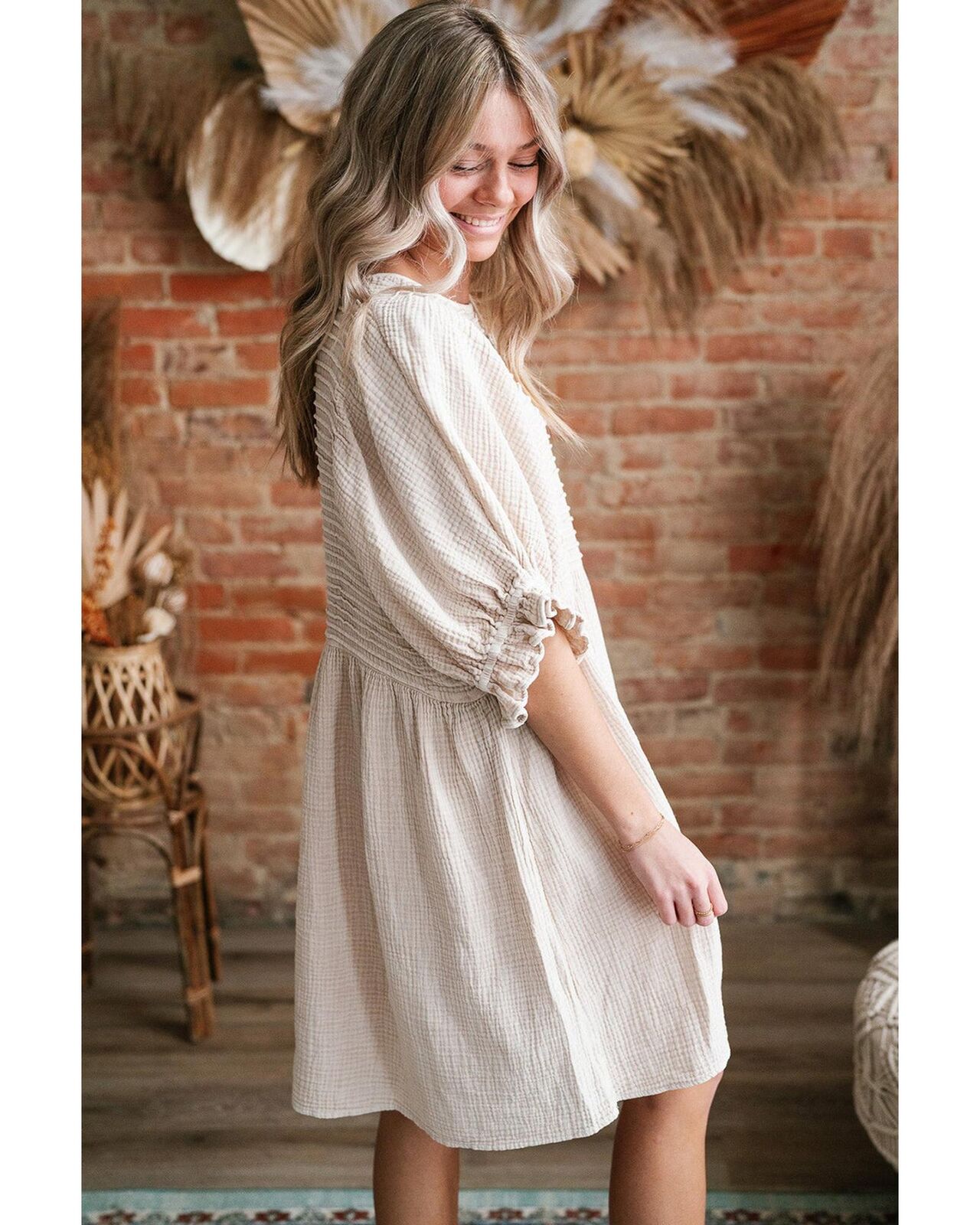 • White Textured Ruffled Puff Sleeve Loose Dress