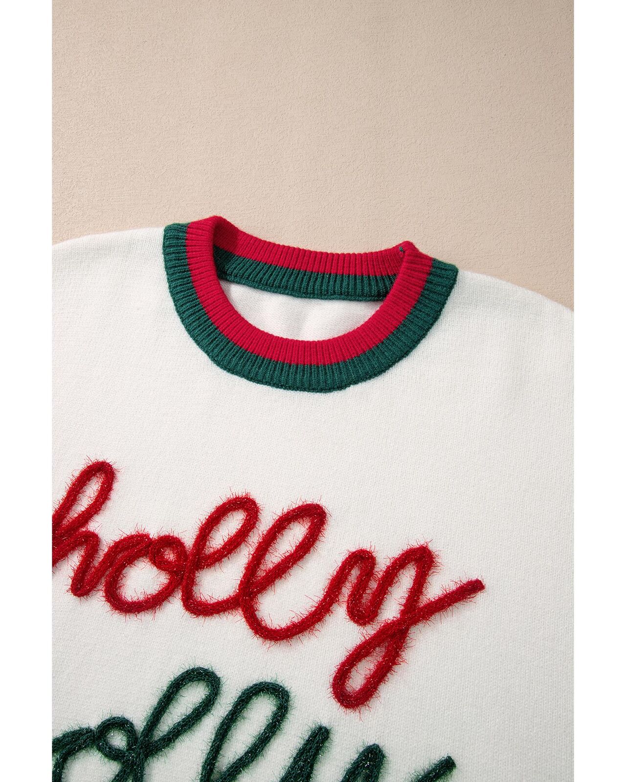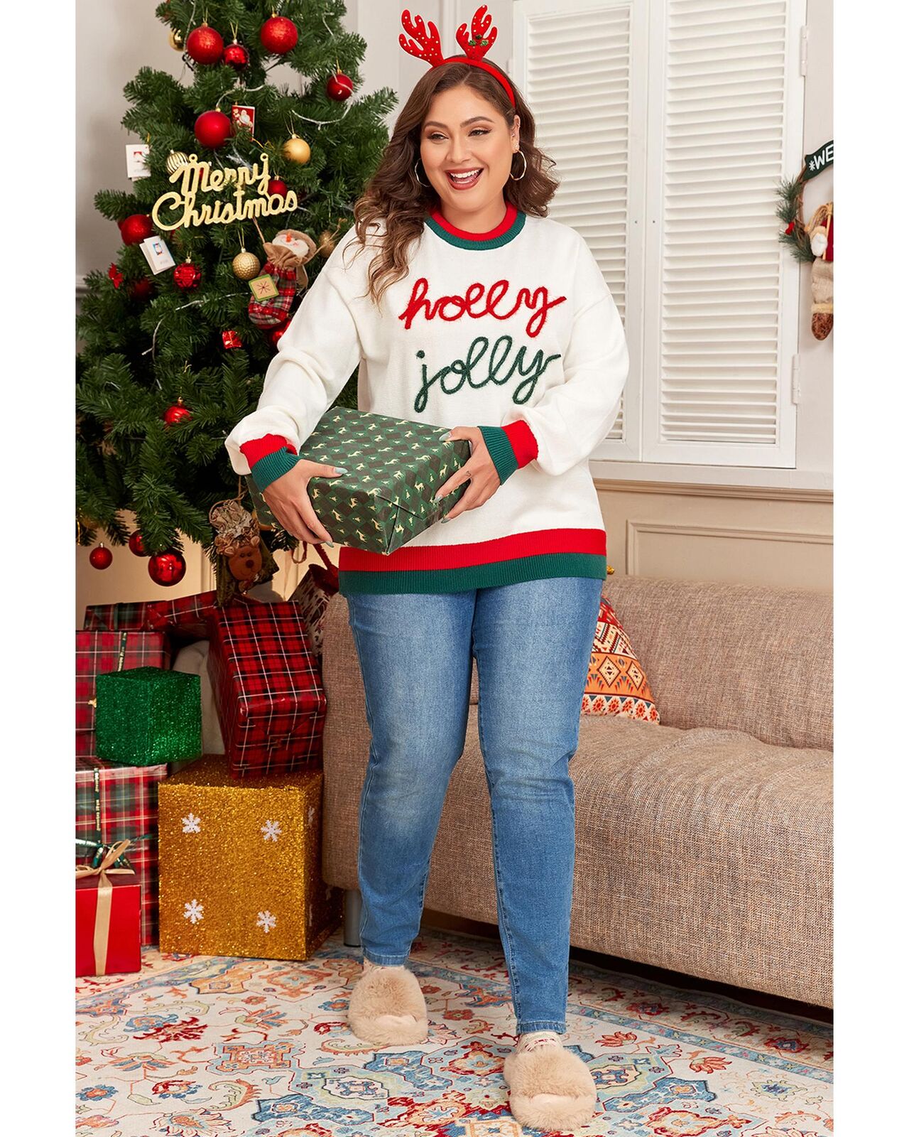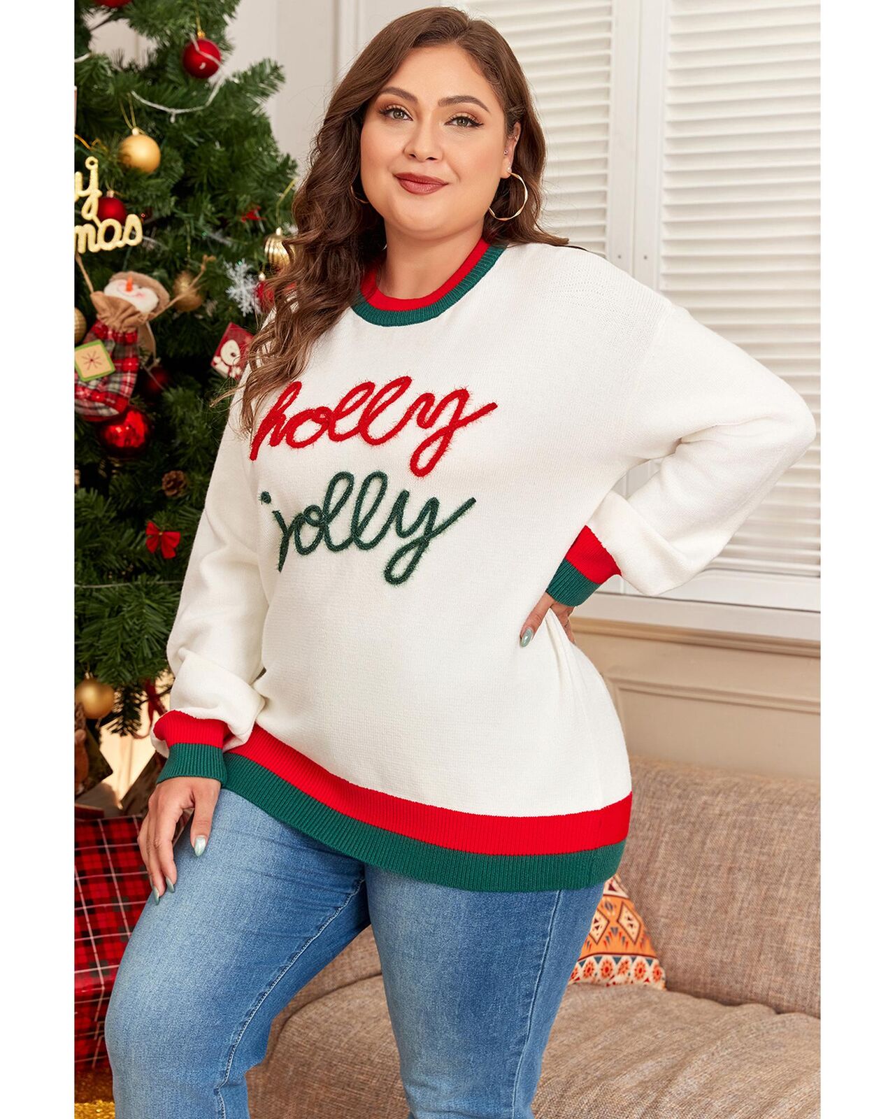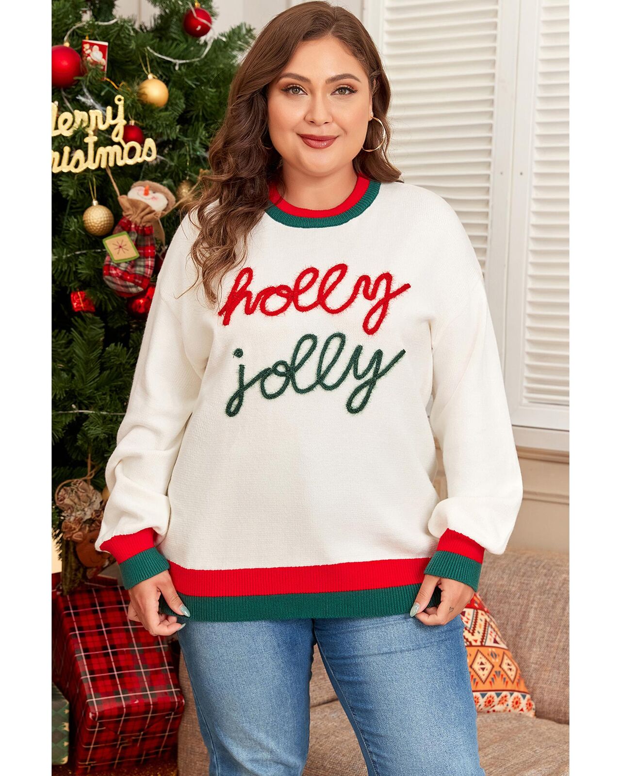 • White Tinsel Holly Jolly Pattern Colorblock Edge Drop Shoulder Plus Size Sweater