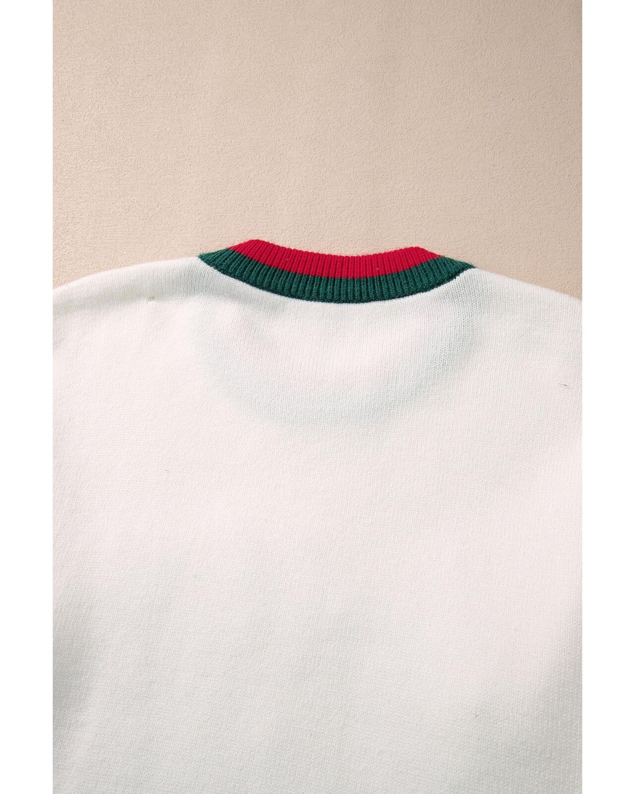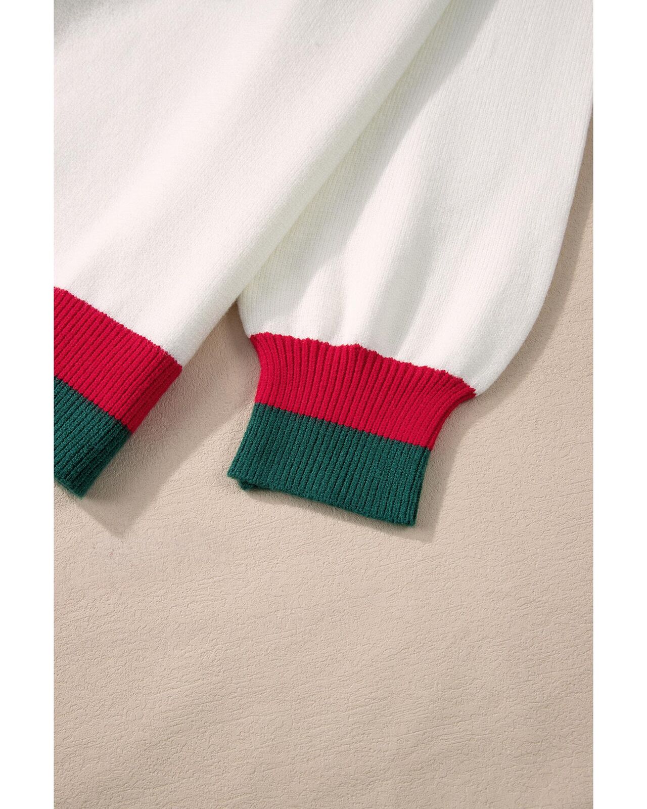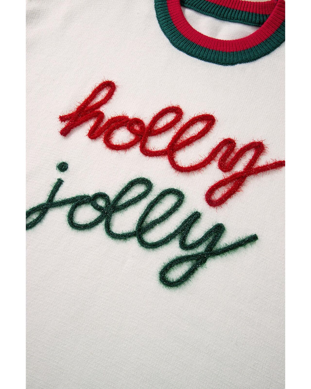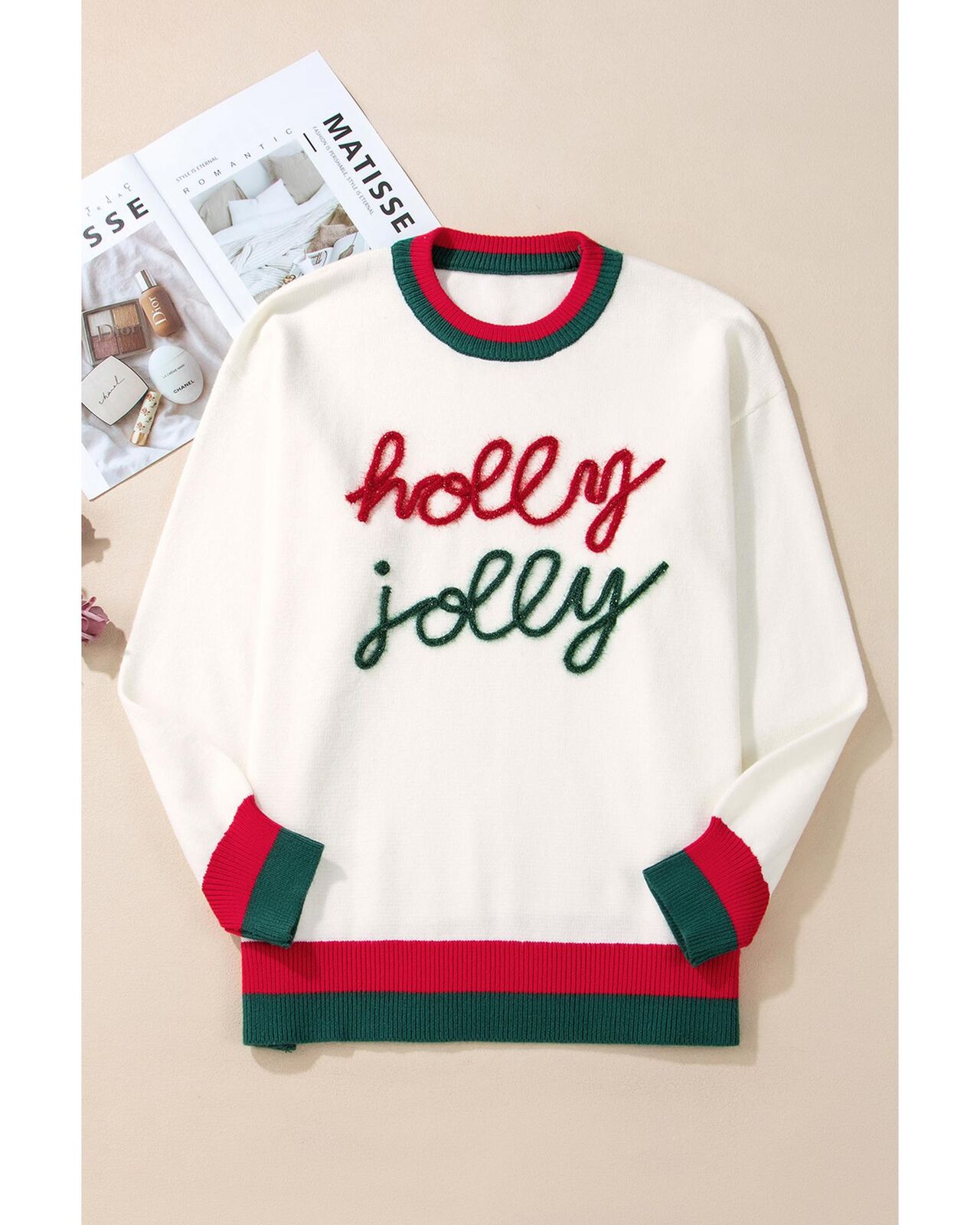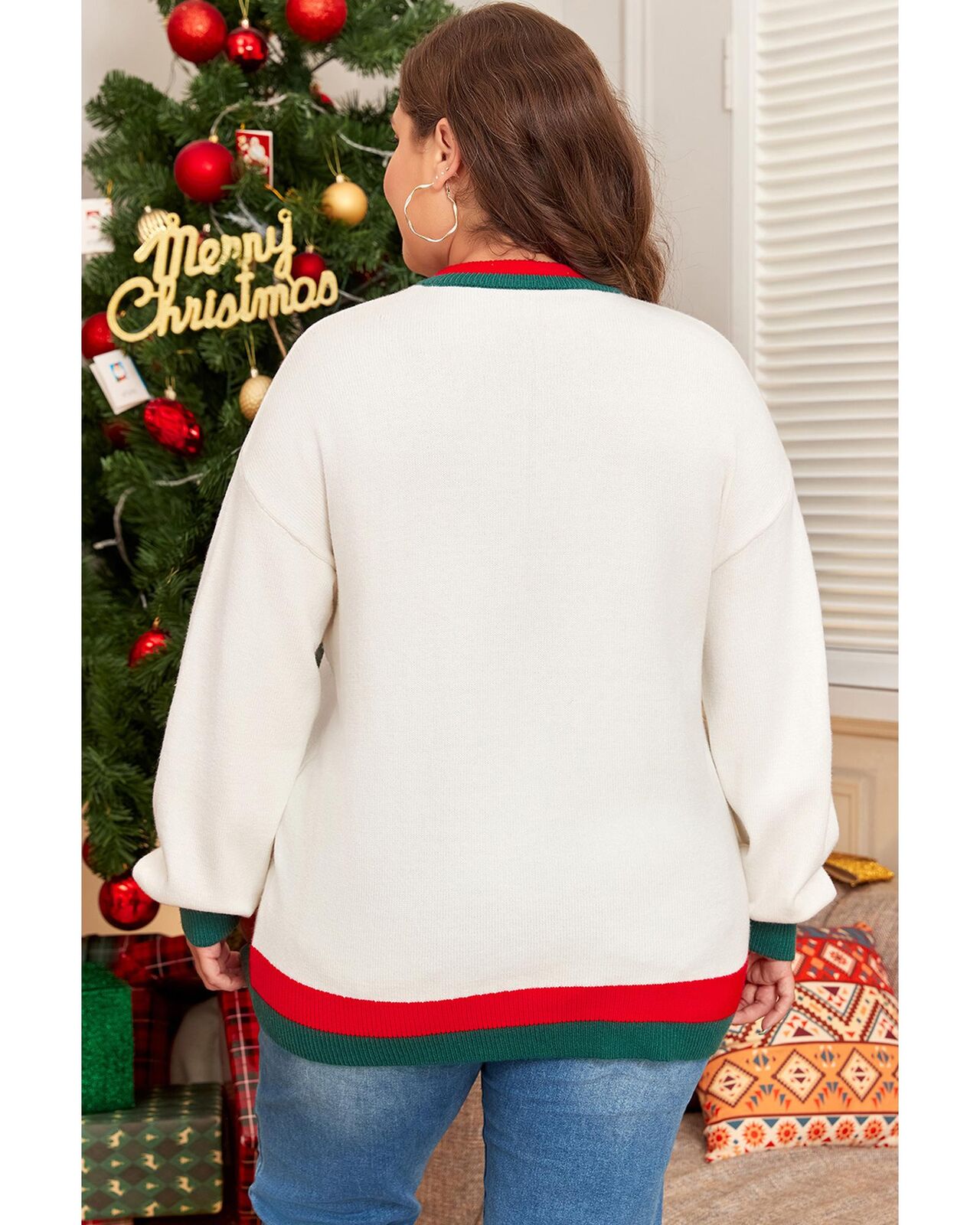 • White Tinsel Holly Jolly Pattern Colorblock Edge Drop Shoulder Plus Size Sweater