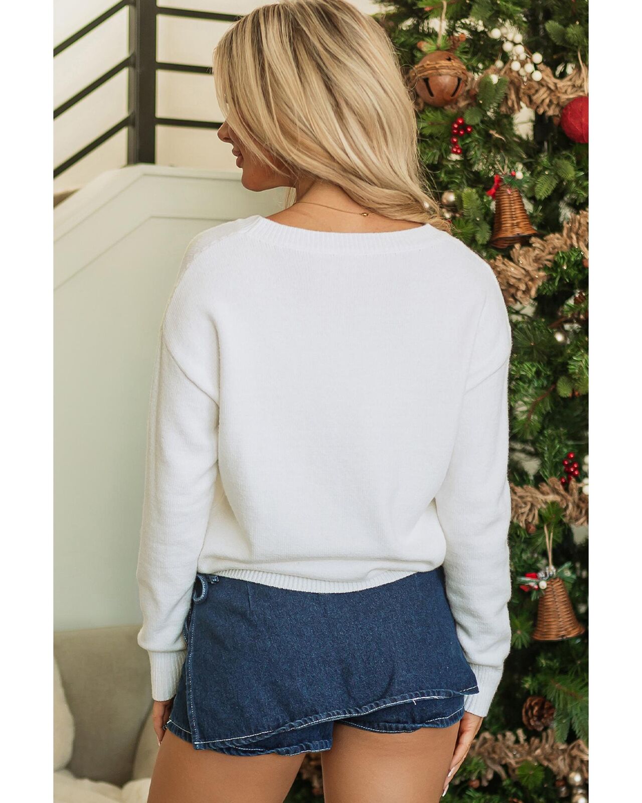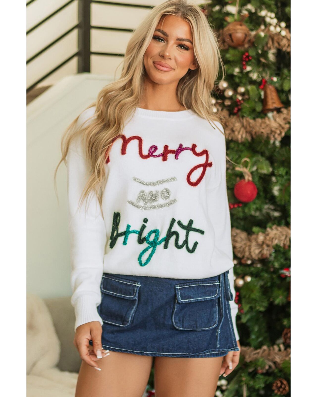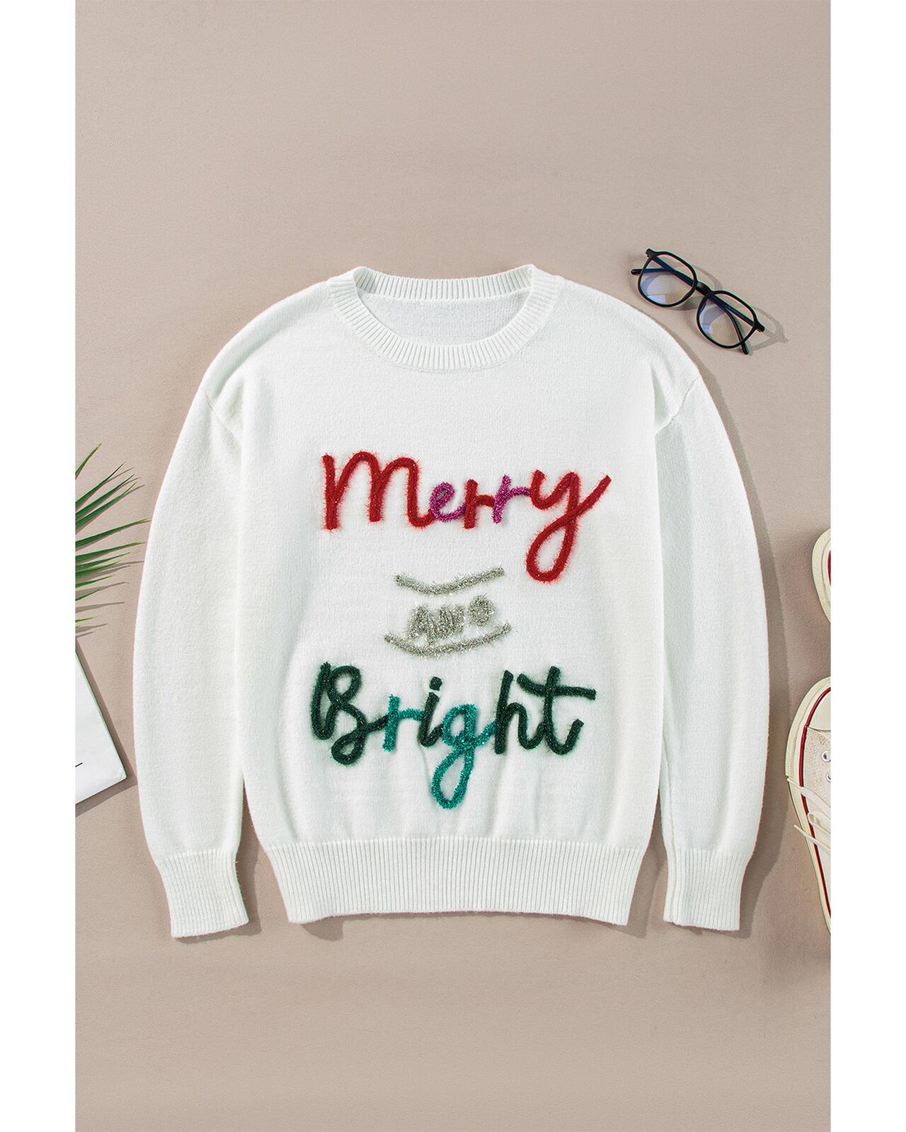 • White Tinsel Merry and Bright Graphic Christmas Sweater