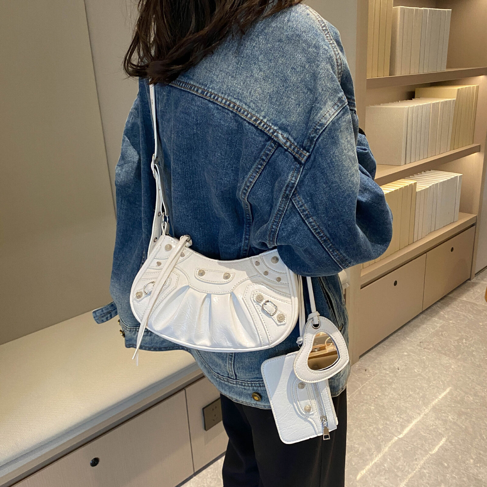 White Vintage Rivet Crescent Moon Bag with Card Holder & Mirror, French Retro PU Leather Shoulder & Crossbody Motorcycle Bag for Women