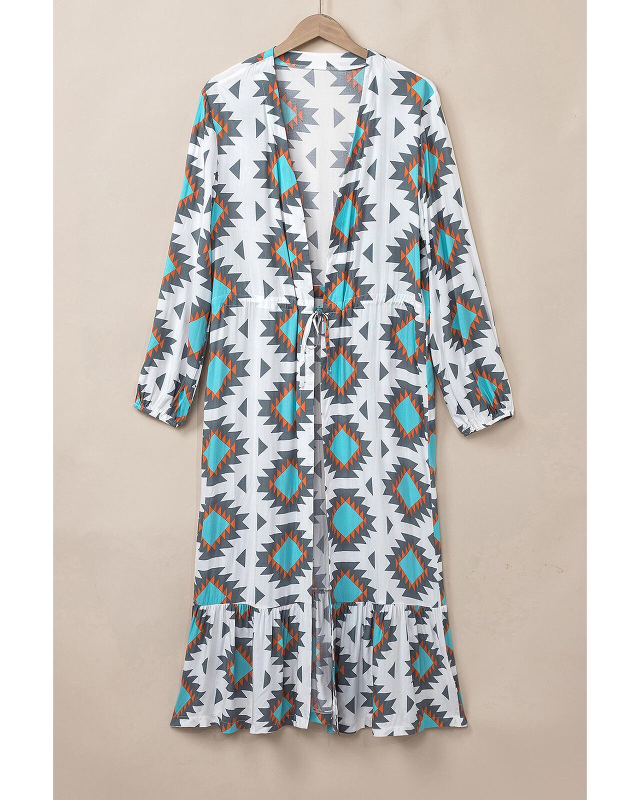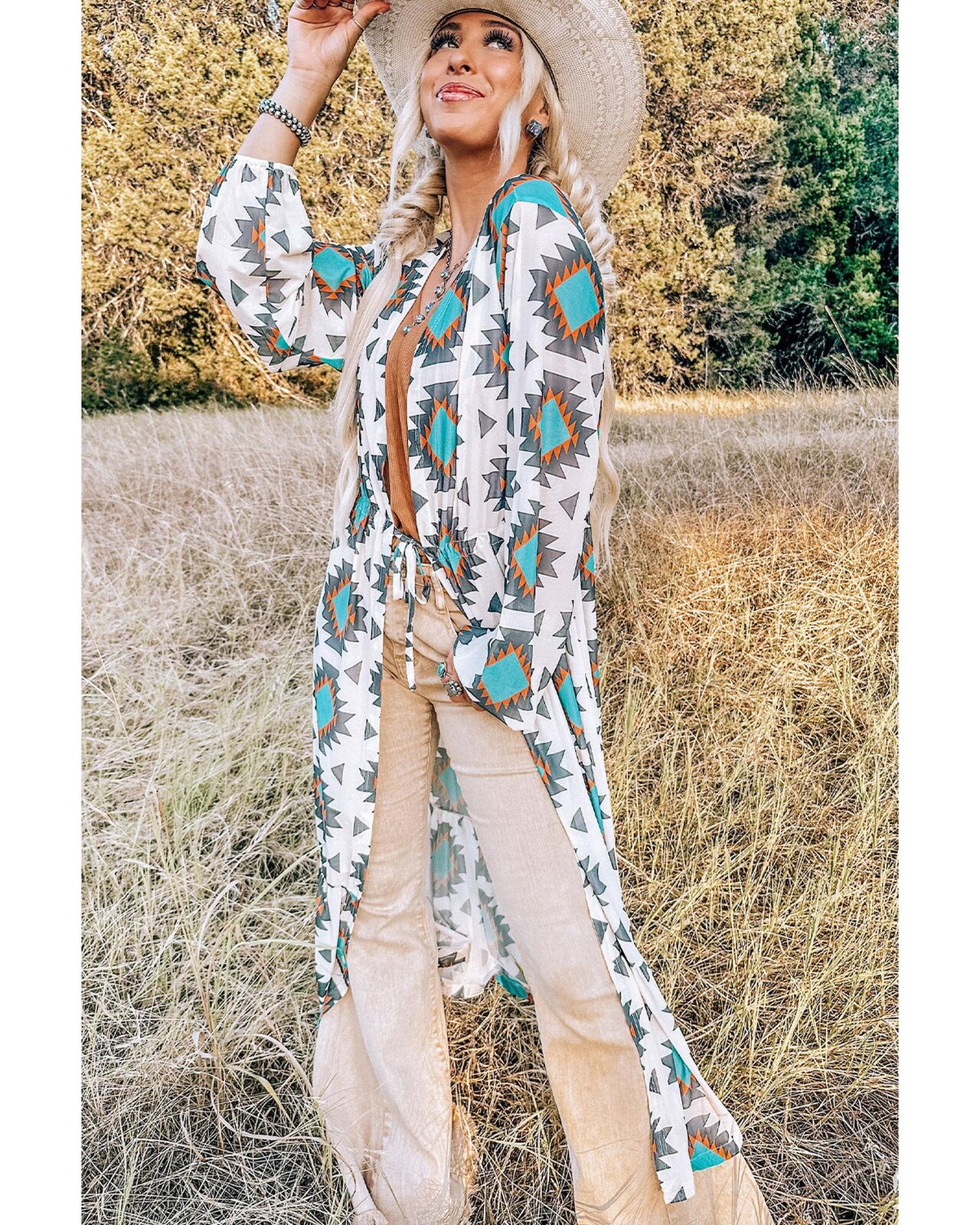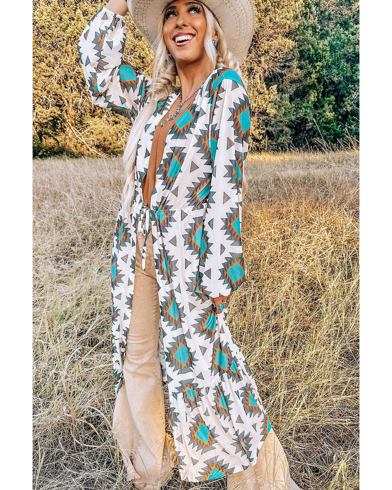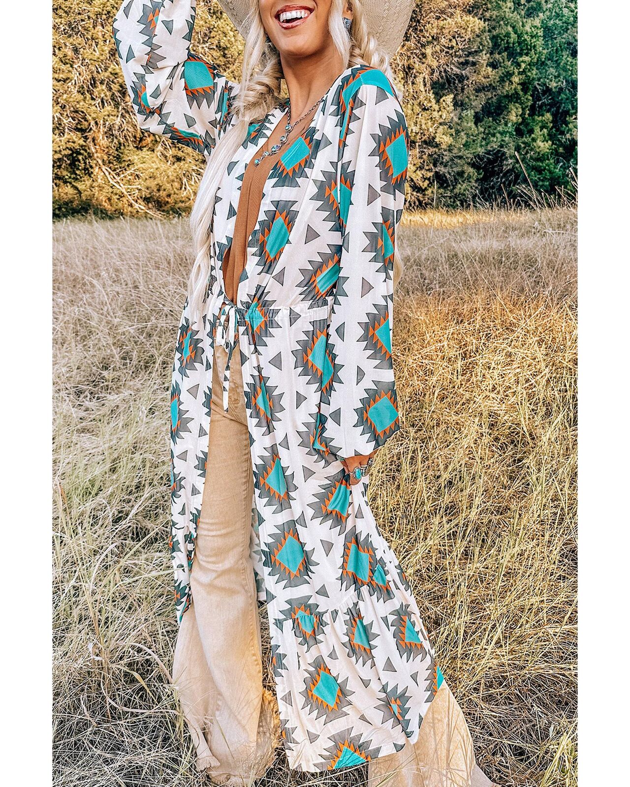 • Stunning White Western Aztec Print Duster Open Front Top