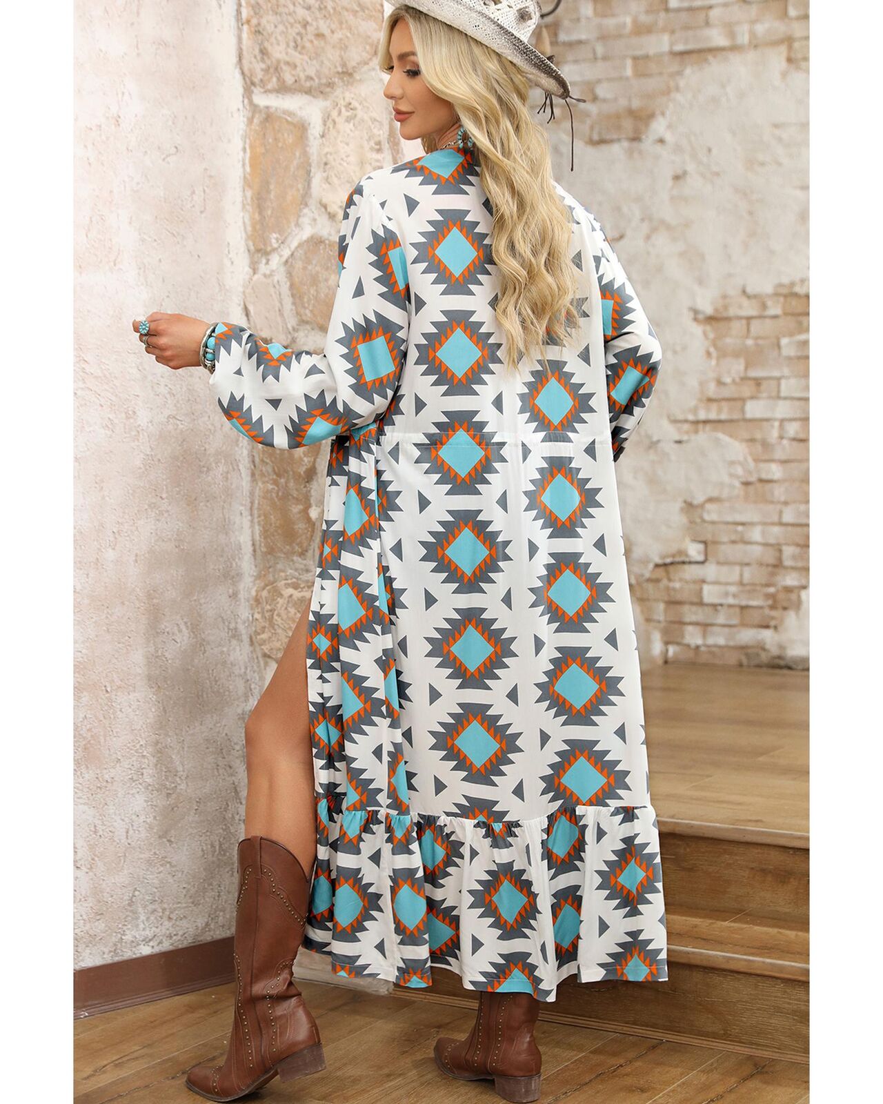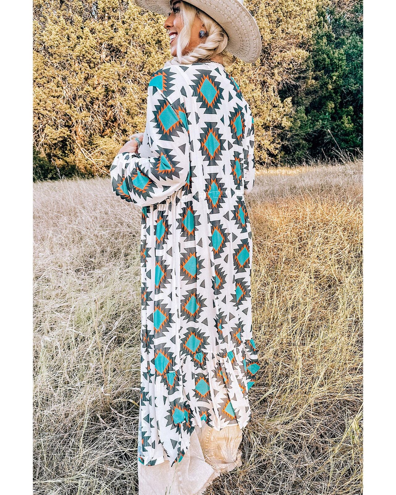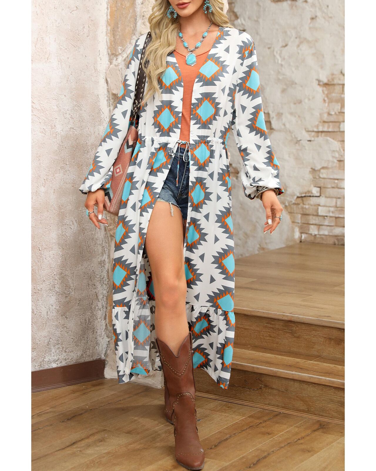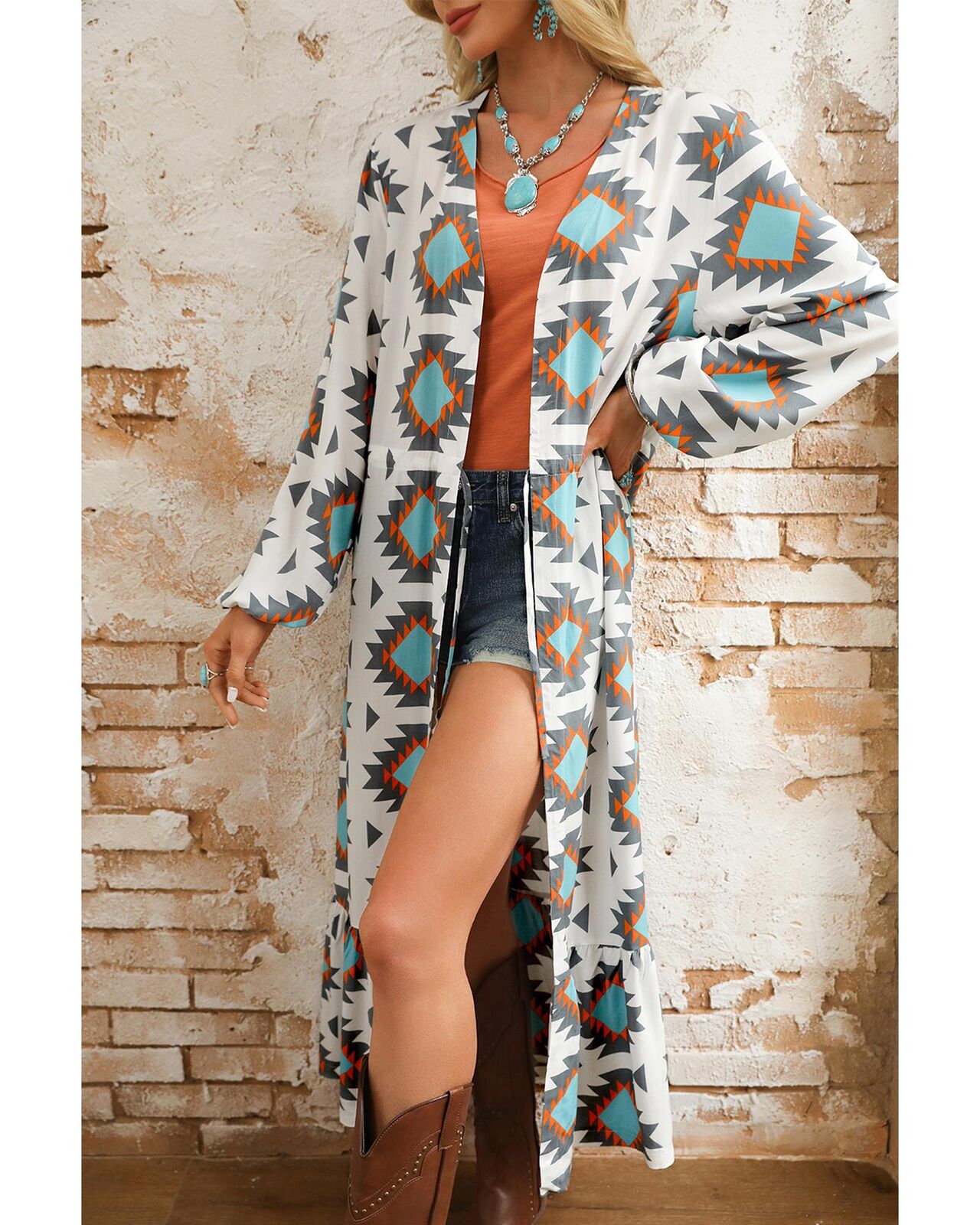 • Stunning White Western Aztec Print Duster Open Front Top